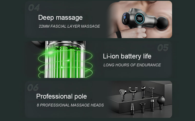 After a high intensity workout, use the fascia gun to relax sore reas, effectively improving lactic acid build-up, combing the fascia and relieving pain and soreness.